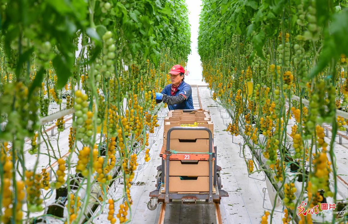 2026年3月22日,工人在乌兰察布宏福农业产业园智能温室里采摘番茄。(王正摄/光明图片)