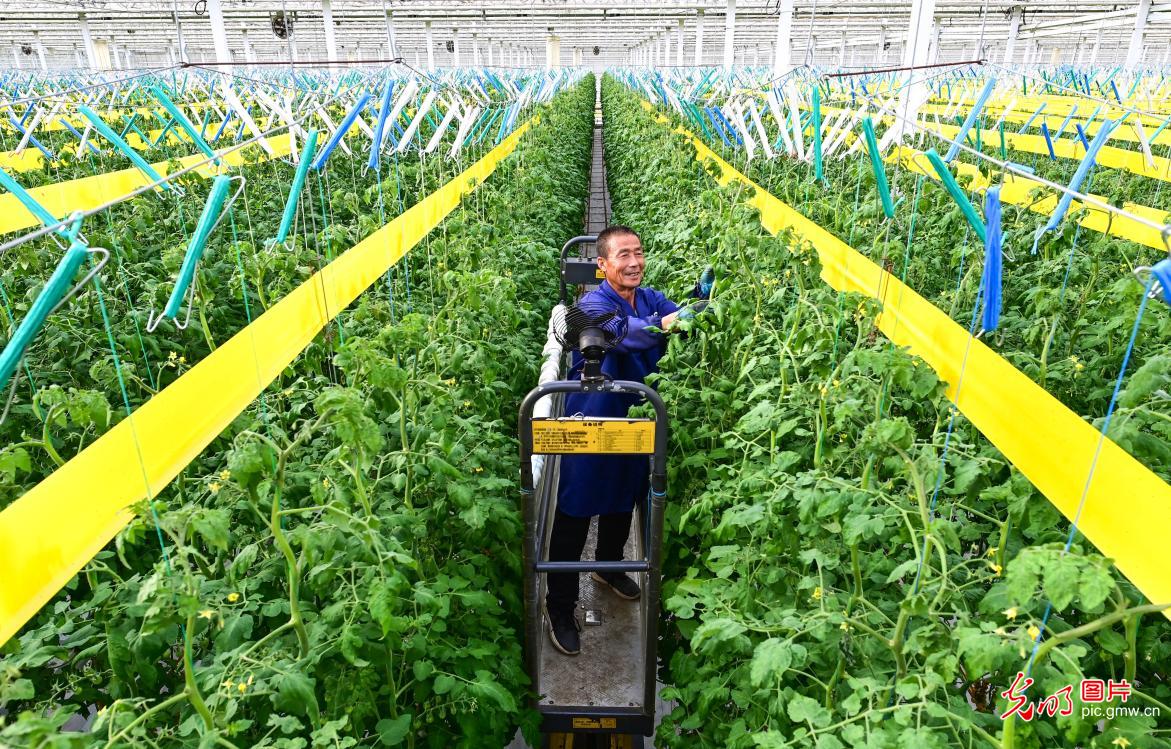 2026年3月22日,工人在乌兰察布宏福农业产业园智能温室里管护番茄。(王正摄/光明图片)