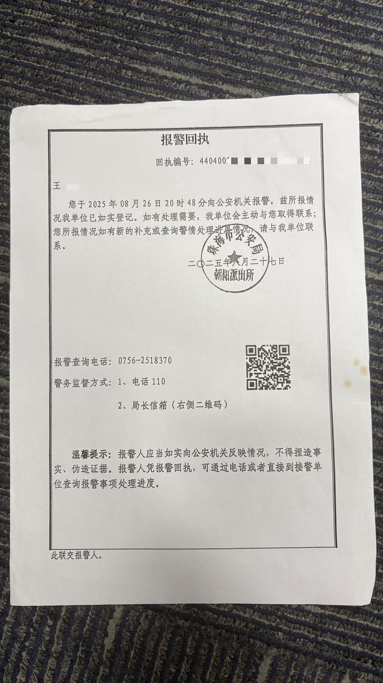 2025年8月26日,家属向珠海市香洲区朝阳派出所报案。