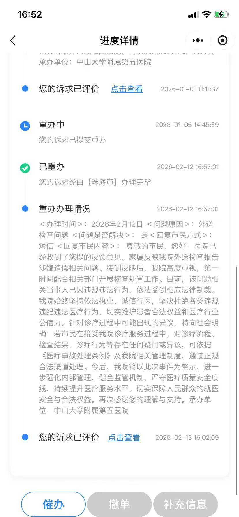 记者获悉,在患者家属向12345平台投诉后,2026年2月12日,患者收到平台的回应。中山五院院方在回复中表示:医院始终坚持依法执业、诚信行医,坚决杜绝各类违规违纪违法医疗行为,切实维护患者合法权益和医疗行业公信力。并以此次事件为警示,承诺将进一步强化内部管理。