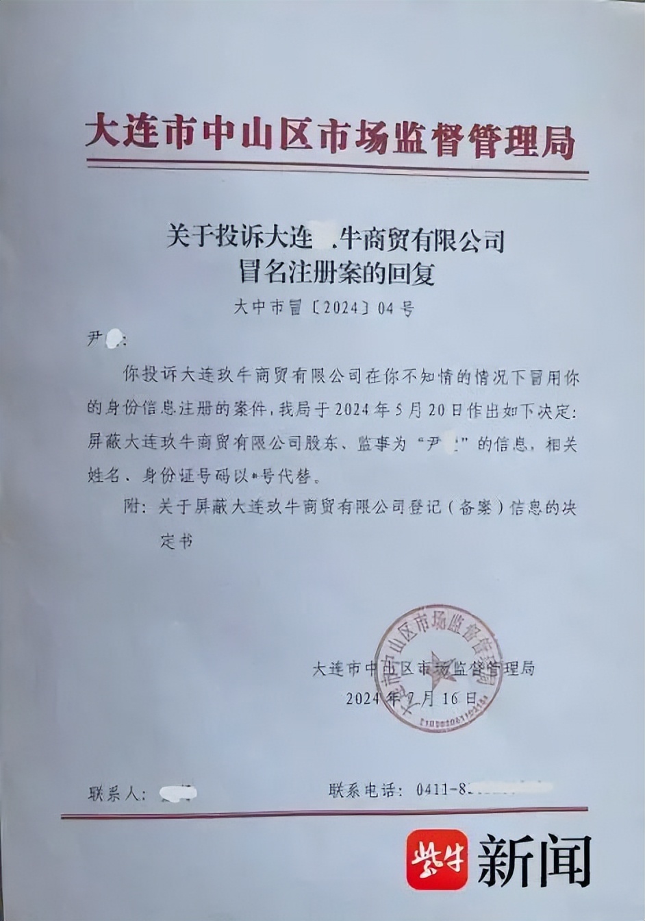 发现该情况后,尹女士立即报警,并通过大连市长热线联系了这两个区的市监局。她告诉记者,中山区市监局很快给她发送了一份表格,她填写完毕后,提交了报警记录、身份证补办证明、毕业工作后的社保证明和纳税证明等证据,中山区市监局随后为她撤销了在某牛商贸的监事和股东身份。