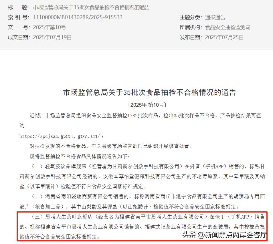 近日,国家市场监督管理总局组织食品安全监督抽检1782批次样品,检出35批次样品不合格。其中,思考人生茶叶旗舰店(经营者为福建省南平市思考人生茶业有限公司)在快手销售的、标称福建省南平市思考人生茶业有限公司销售的、福建武记茶业有限公司生产的金骏眉,柠檬黄检出值达0.378g/kg,不符合食品安全国家标准规定。
