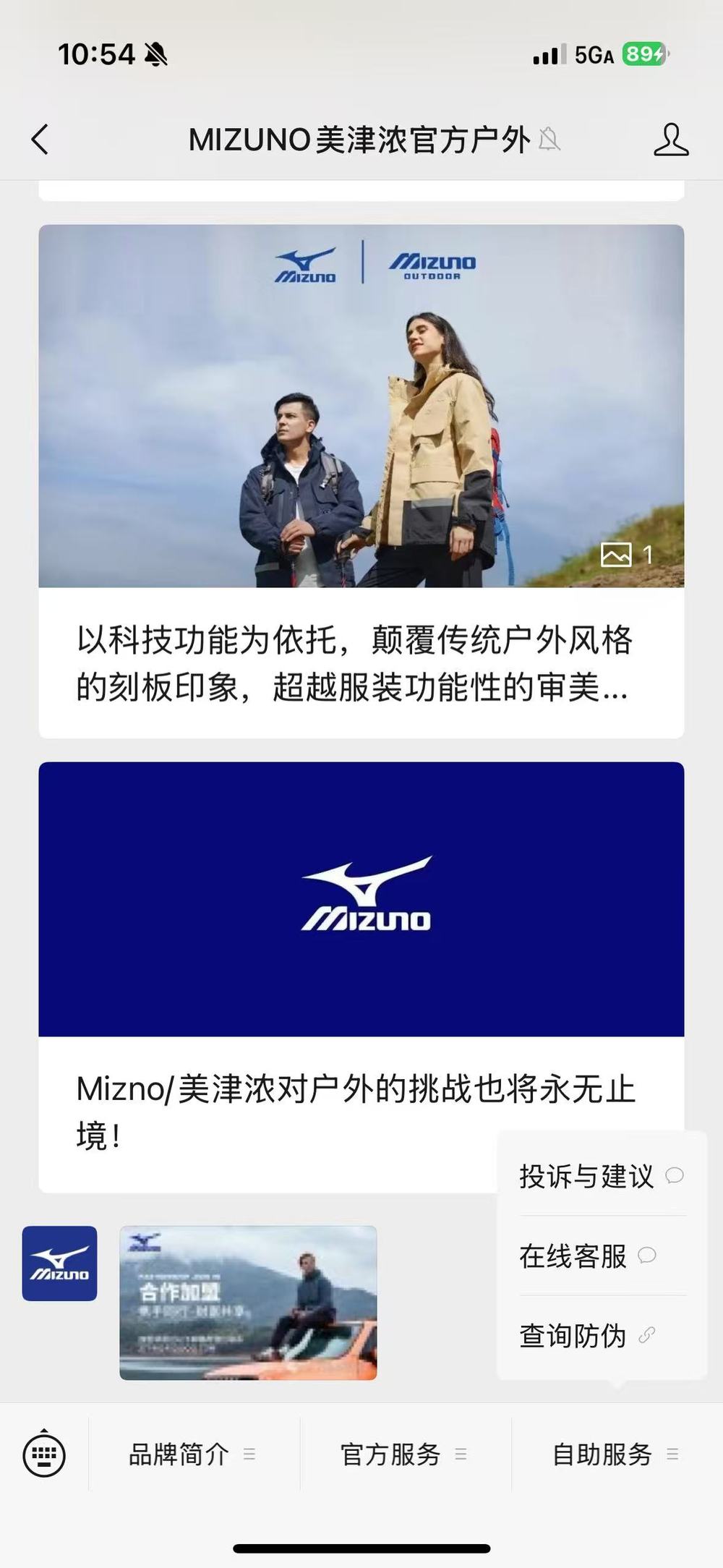 而这个“黑标”户外系列的运营方,即邢先生扫码进入的公众号主体“上海名飞”也显得混乱。在该公众号“MIZUNO美津浓官方户外”的页面上,一处品牌宣传语出现拼写错误,将“Mizuno”错拼为“Mizno”。该公众号曾发布“合作加盟”广告,联系方式为一个QQ邮箱。记者以加盟商身份联系对方后,对方表示“现在不加盟了”。就消费者投诉的旧吊牌、商品质量等问题,对方则未回应。