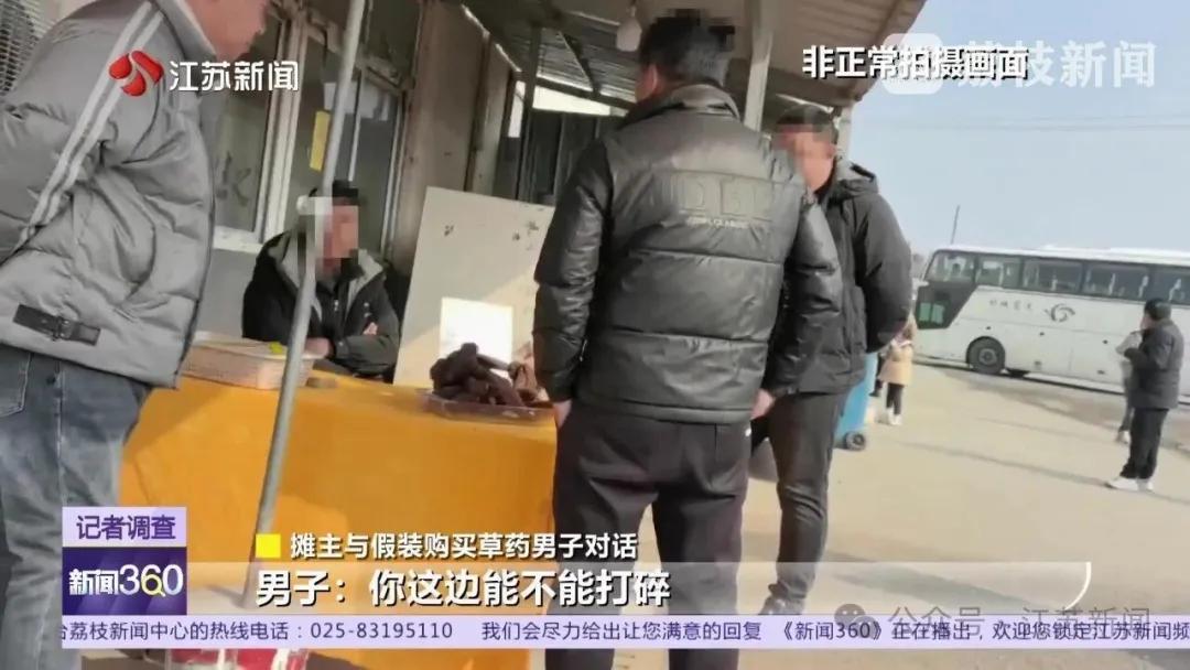 在这个皖顺服务区,院子内也有草药摊位,销售所谓的藏参、铁皮石斛等。一名男子正在和摊主“演戏”,吸引乘客购买。