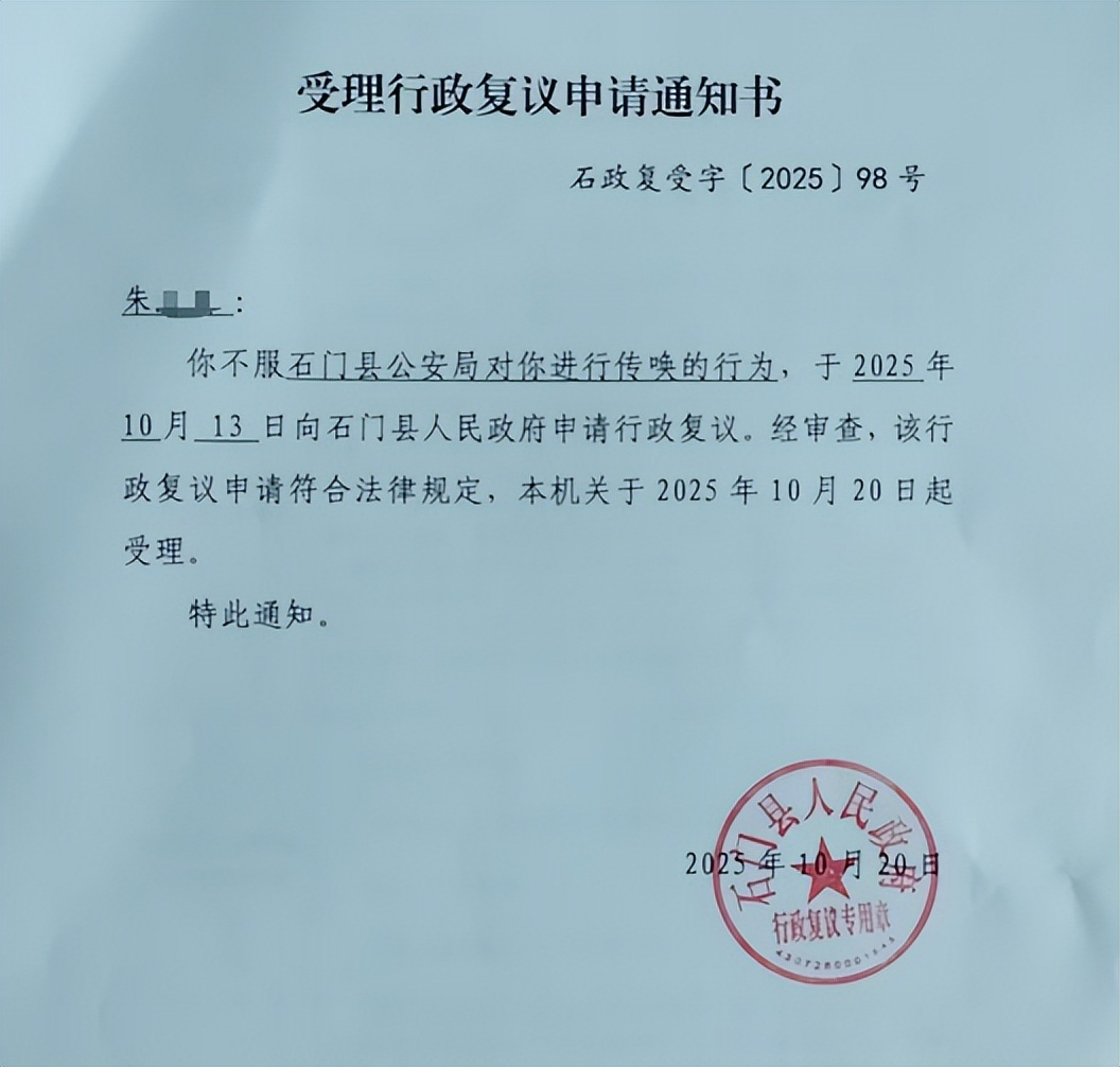 10月13日,朱女士不服传唤,向石门县政府提起行政复议。