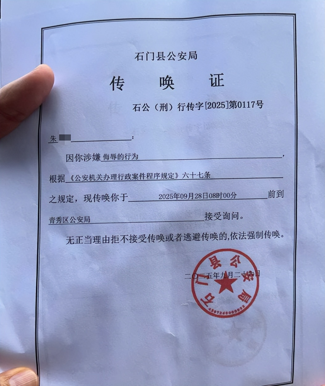 民警出示的传唤证显示,因朱女士涉嫌侮辱,要求她到青秀区公安局接受询问。