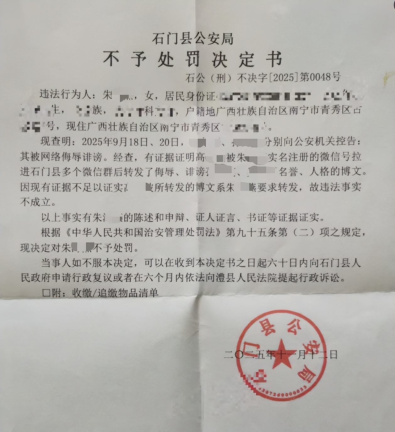 11月16日上午10:30左右,朱女士收到湖南石门县公安局的邮政挂号信,打开一看是一份《不予处罚决定书》。