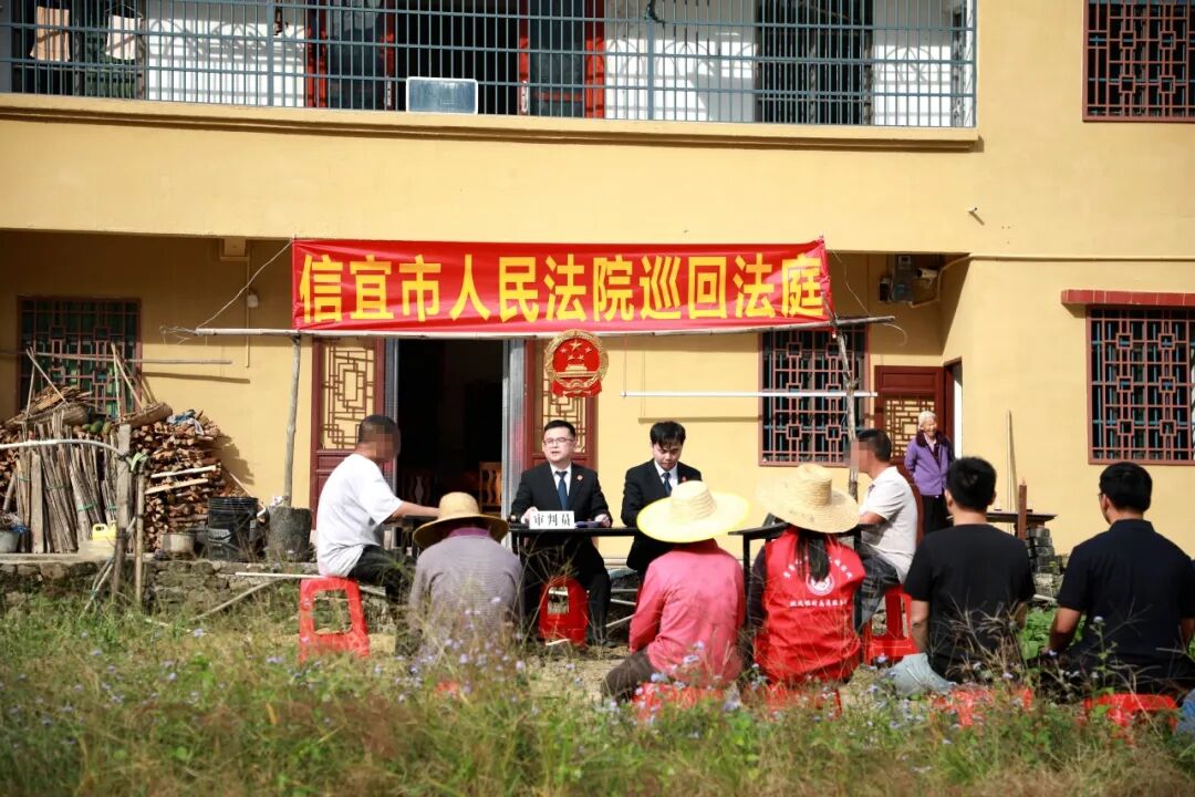 金黄稻浪翻涌的梯田旁,一枚悬挂的国徽,几张简易的桌凳,搭起了临时法庭。近日,广东省信宜市人民法院朱砂人民法庭将巡回审判案“搬”进贵子镇秋风根村梯田核心产区,就地开庭调解了一起谷种购销合同纠纷,更把法治课堂开到了田埂上。