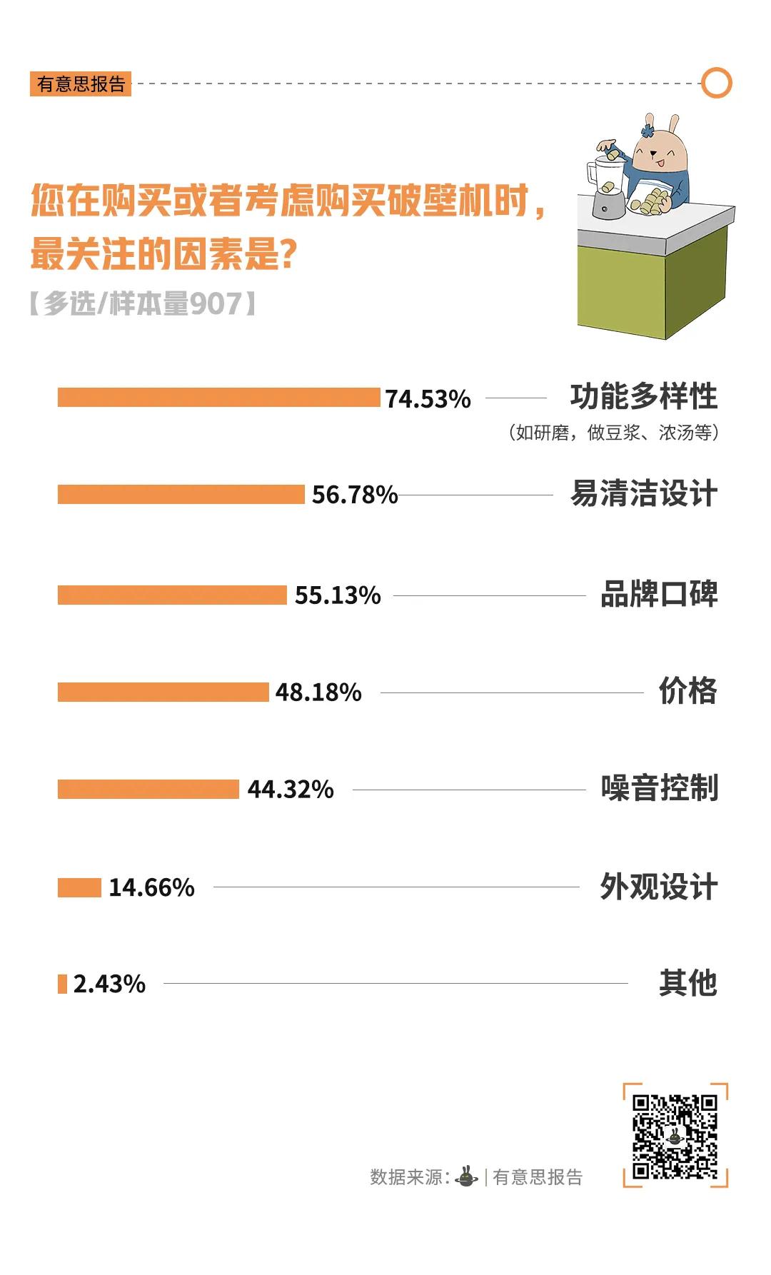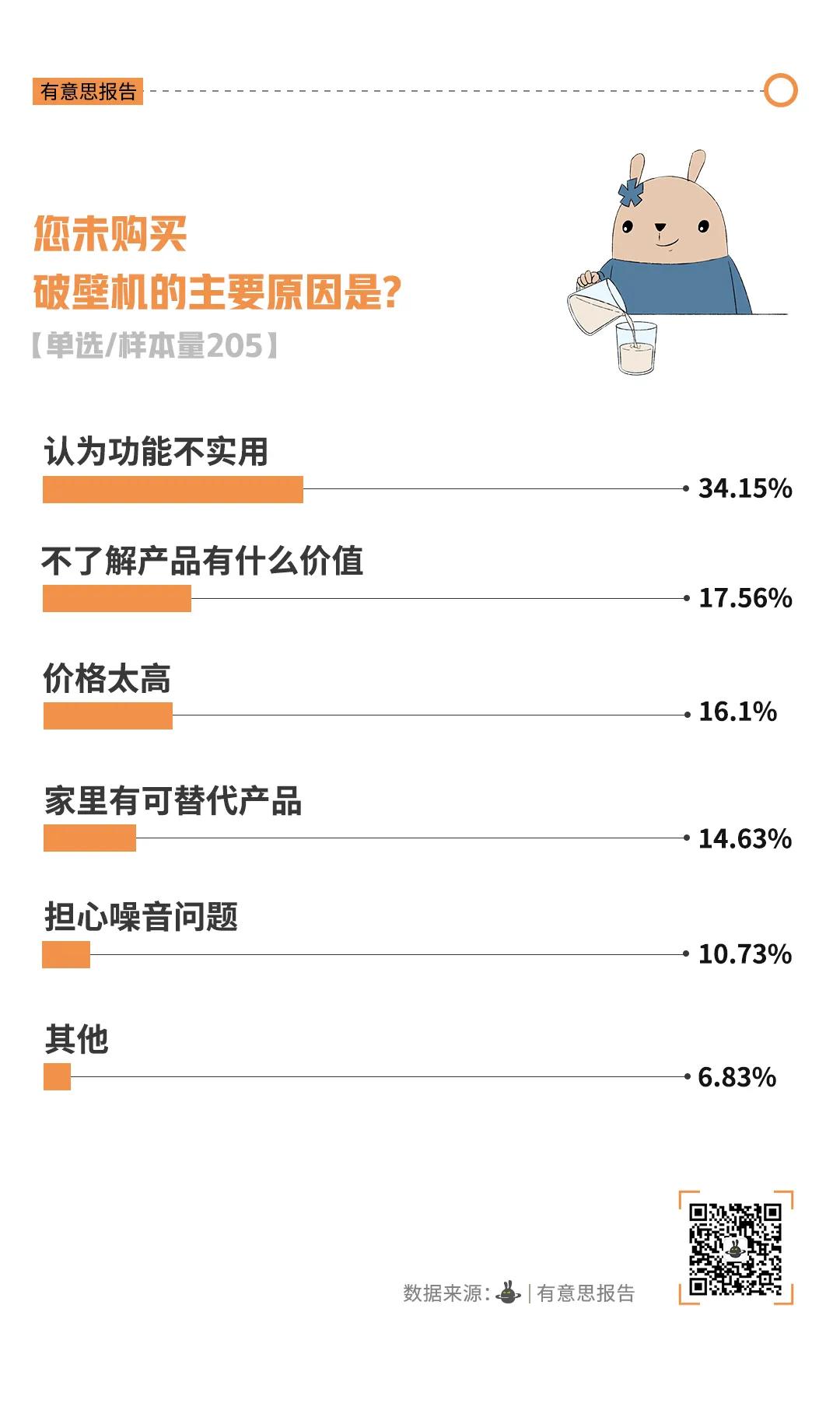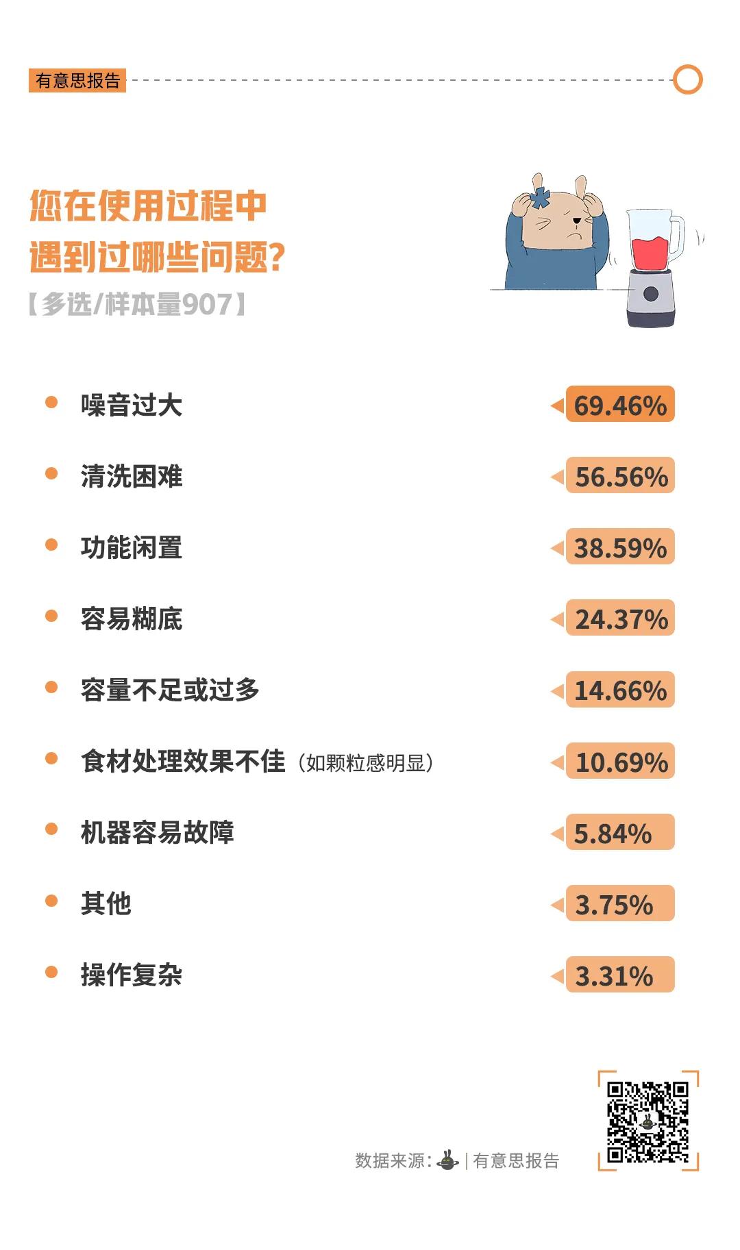 也跟豆浆机一样,噪声一直是破壁机用户的痛点。有意思调查中,近七成人将过大的噪声视为破壁机使用过程中**的问题。