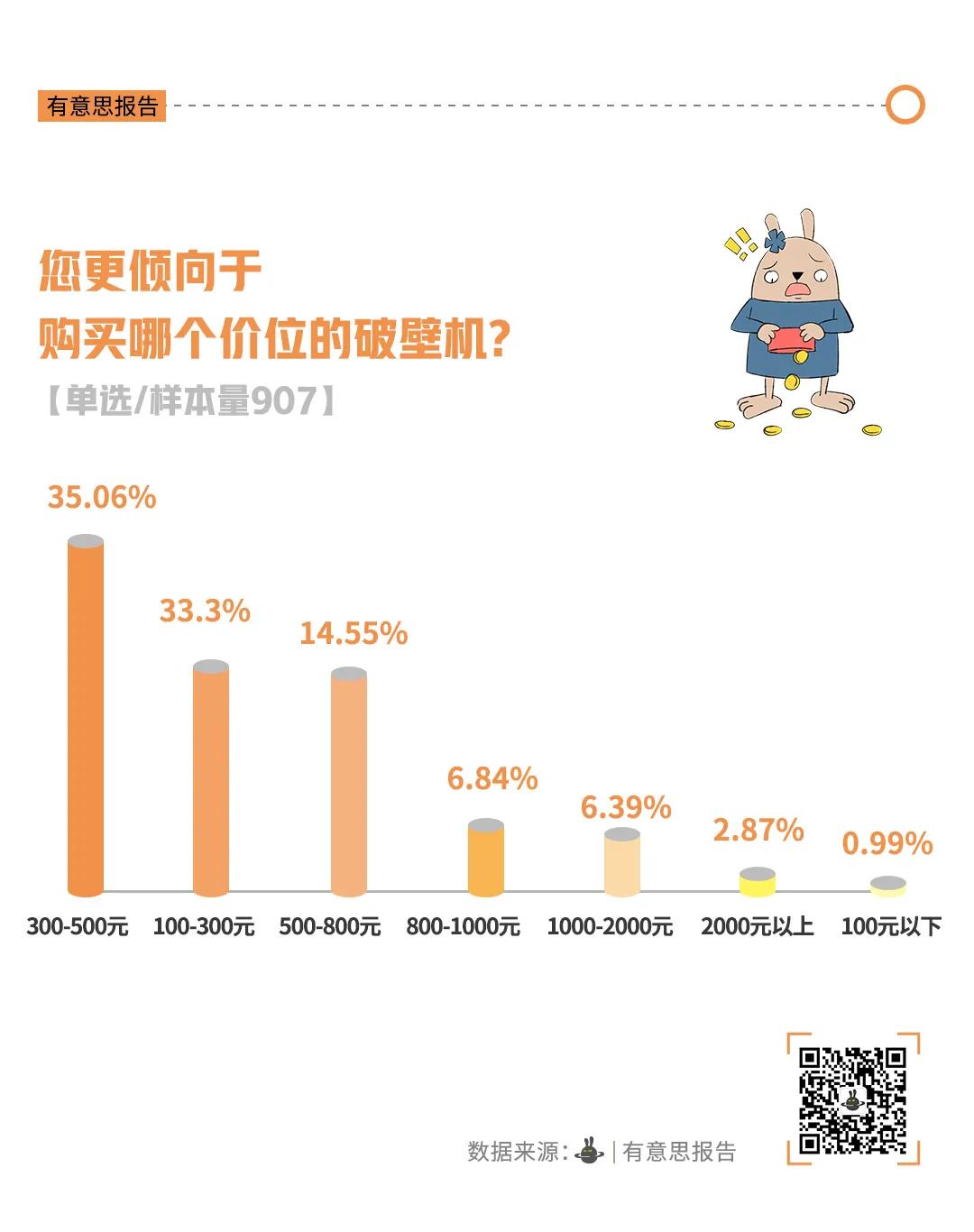 这也与有意思调查中最多人购买的破壁机价格基本匹配。约35%的受访者选购的破壁机在300—500元,甚至还有1/3的人购买的破壁机价格更低,只需要100—300元。