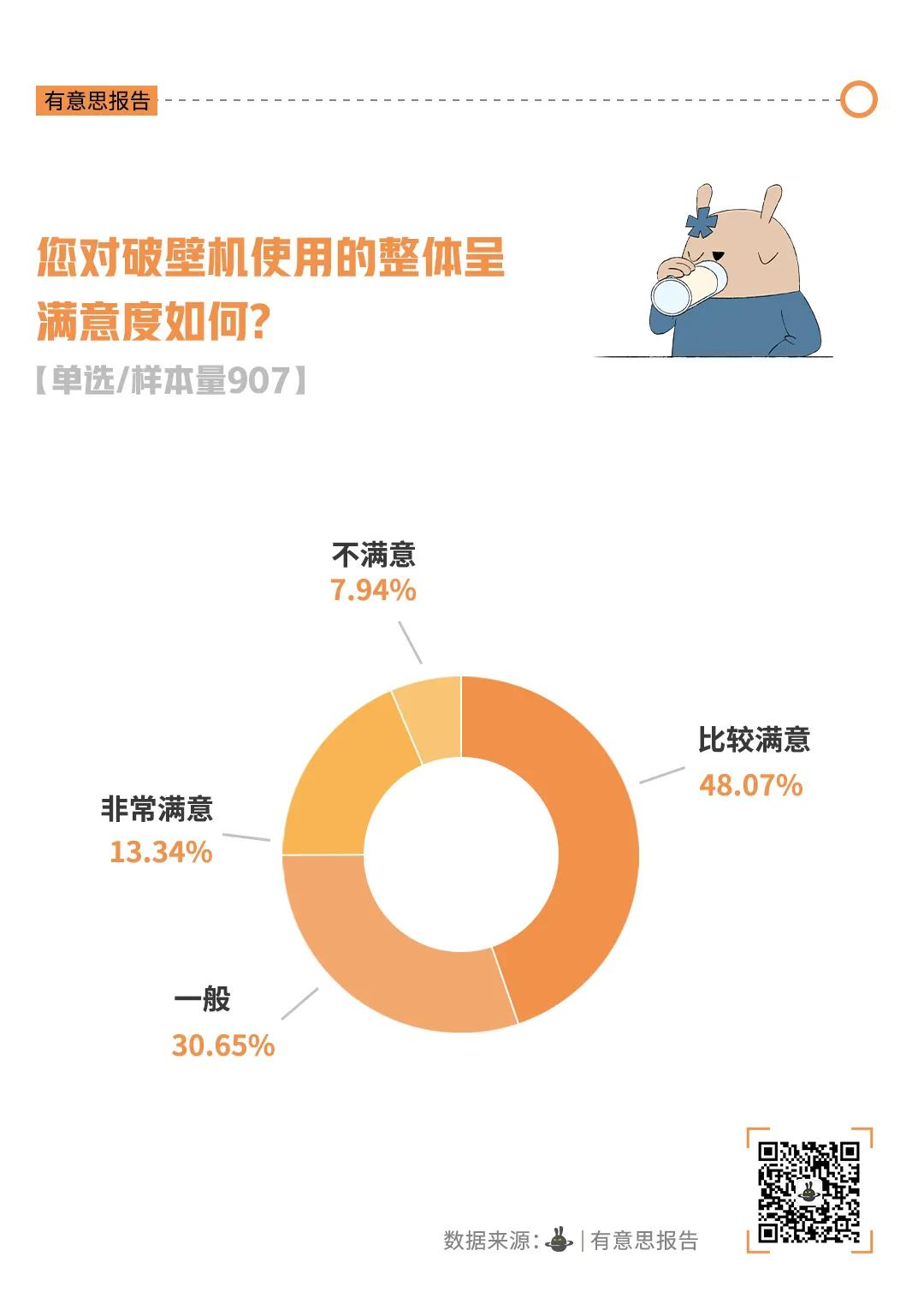 虽然闲置率颇高,但近半数人对破壁机的使用感还算“比较满意”。