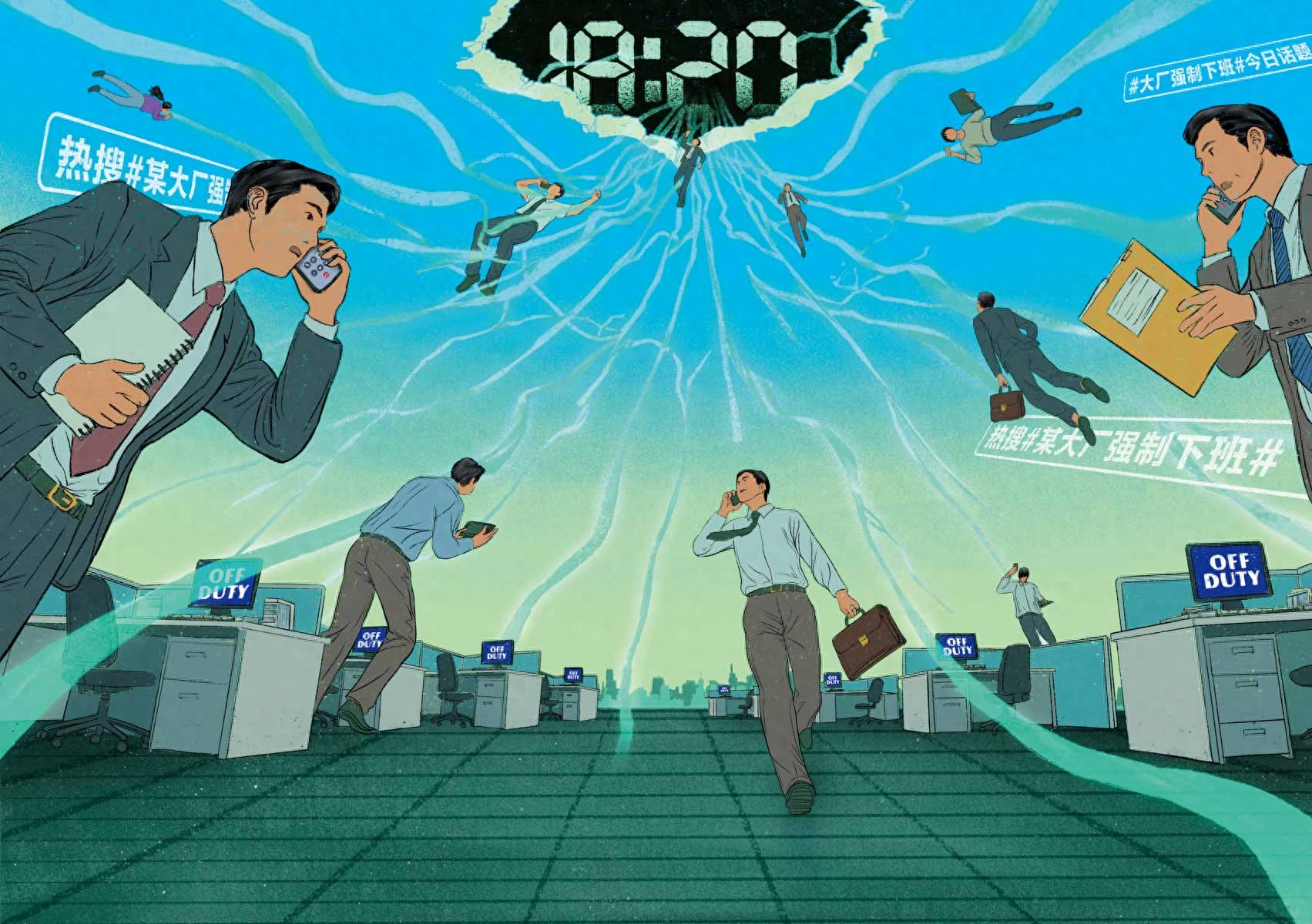 航空科技公司大疆的员工将强制下班的行动描述得像一场地震演习:晚上21时,每个部门的人力资源官在楼层内检视,逐一扫过工位,还没有离开的人必须在一分钟内收拾东西下班,整层楼在几分钟内变得空空荡荡。