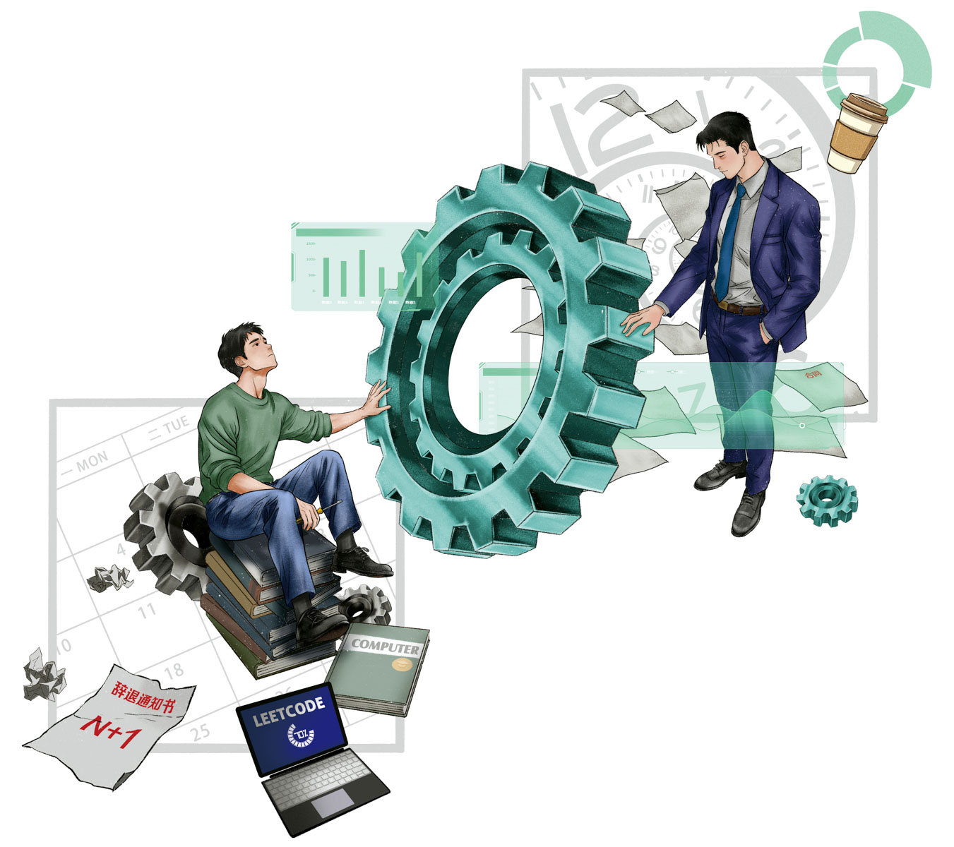 管理层用书面论证和数据去装点意义,而作为一个齿轮的基层员工,最显眼的表演就是加班(卢俊杰/图)
