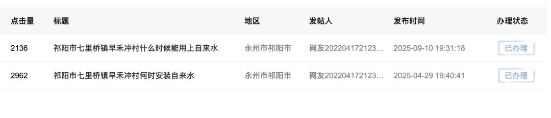 今年4月,网友“232655”通过红网《百姓呼声》栏目留言询问,祁阳市七里桥镇早禾冲村何时安装自来水?