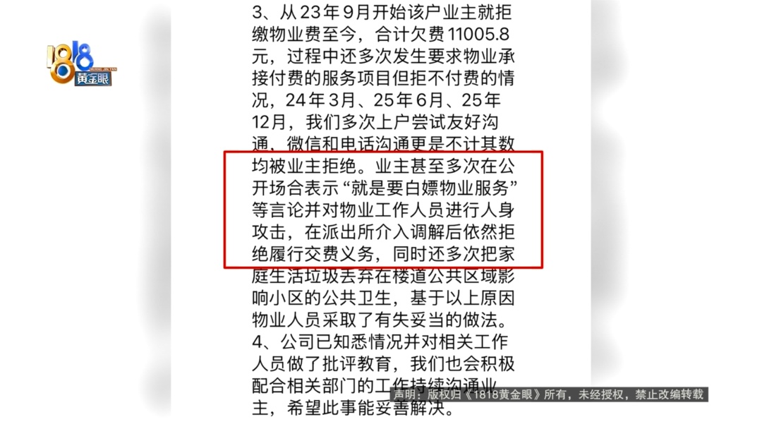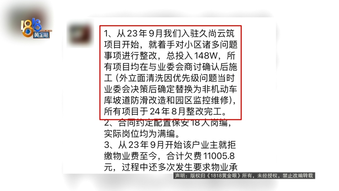 物业公司方面回复记者,从2023年9月入驻项目开始,公司就对小区进行整改总投入148万外立面清洗。关于物业费,业主多次在公开场合表示“就是要白嫖物业服务”等言论,并对物业工作人员进行人身攻击。