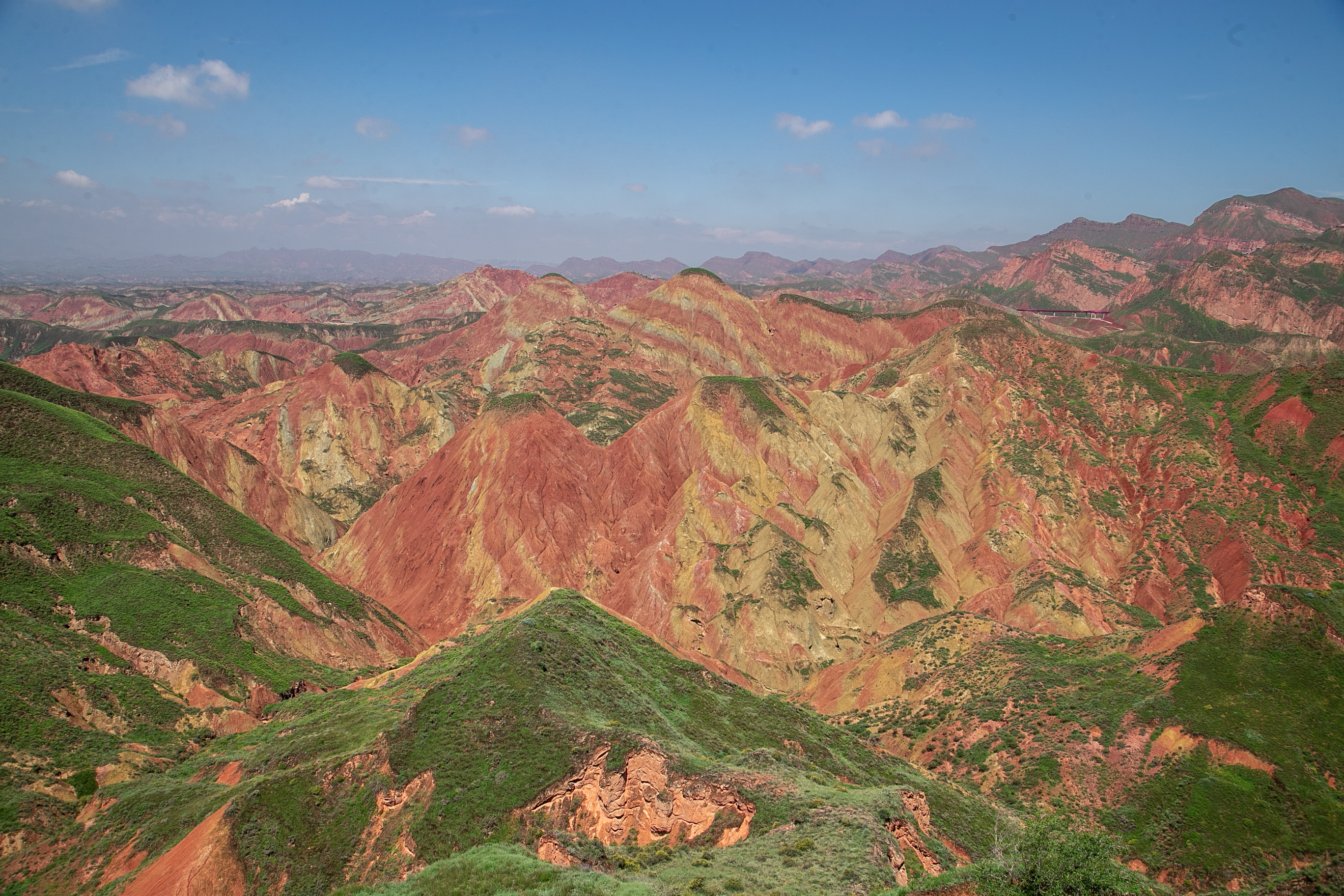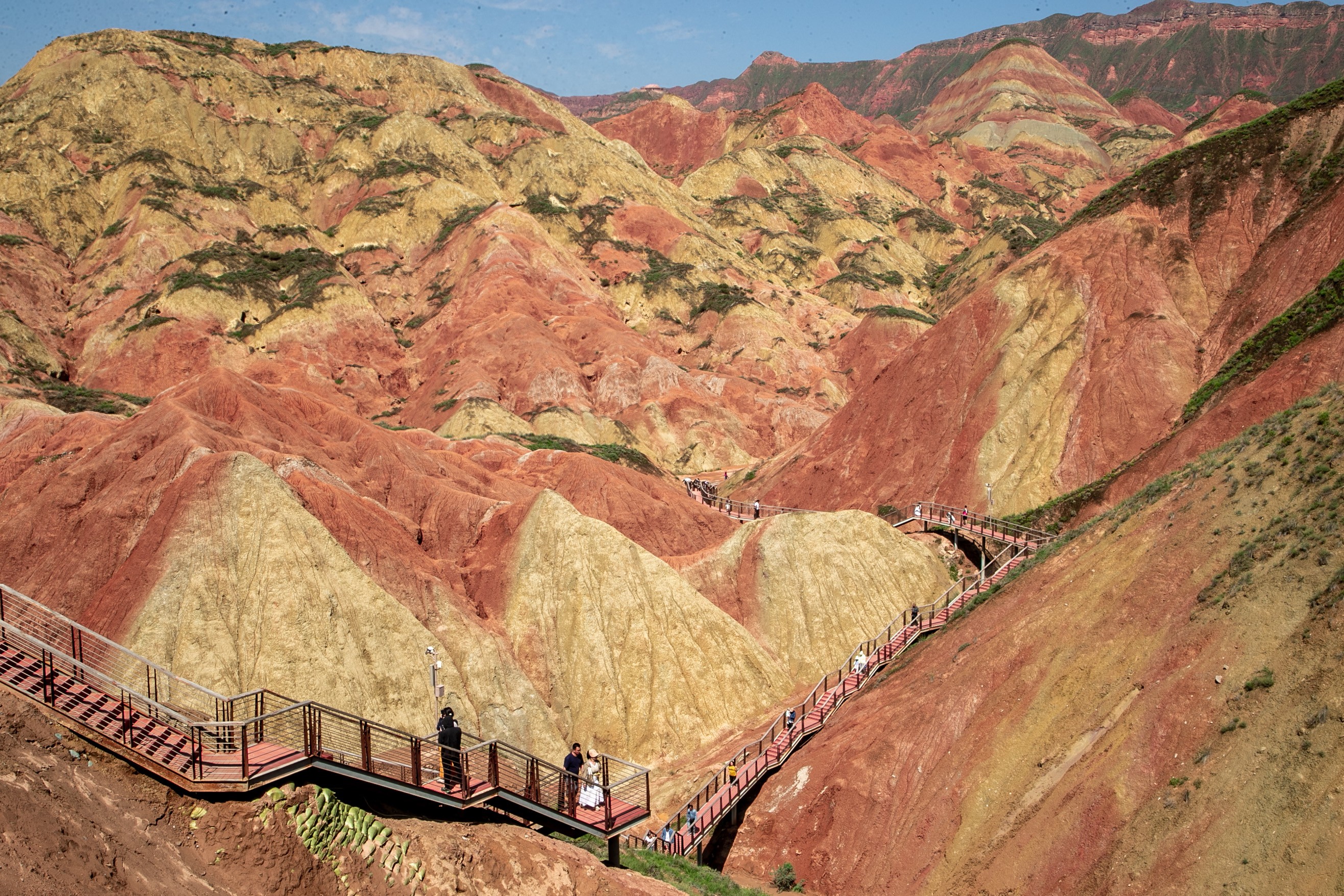 漫步景区,放眼望去,红色与青灰色交错分布,恍若置身于一幅水墨丹青中。移步登高,起伏的“彩丘海浪”直通天际。“人在画中游,我从景中来。”这是不少游客的感受。