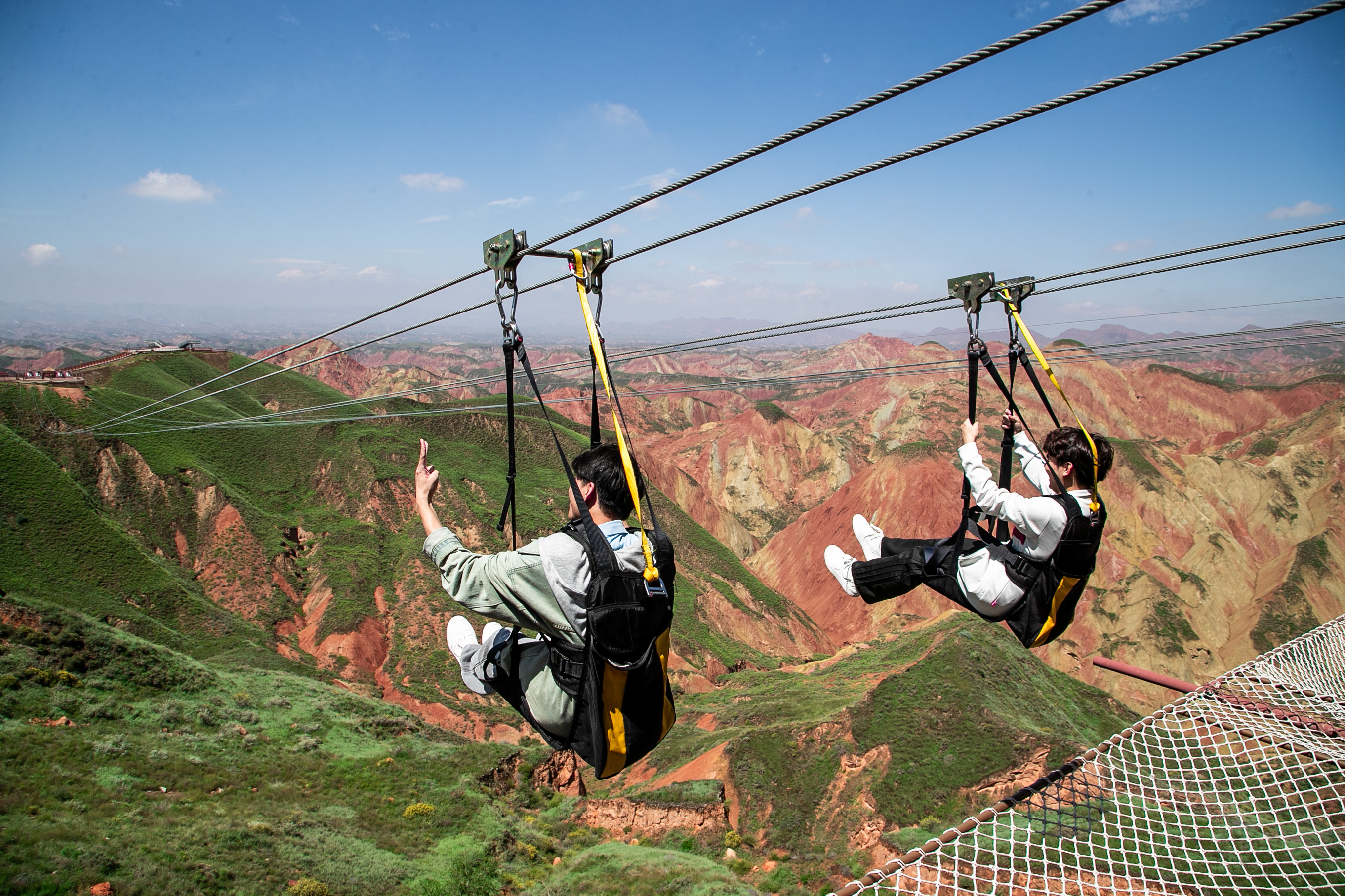 首次体验低空飞行的游客刘大伟赞叹:“从空中俯瞰,连绵的彩丘和丹霞地貌犹如大地泼墨而成的瑰丽画卷,雄浑而又梦幻。”