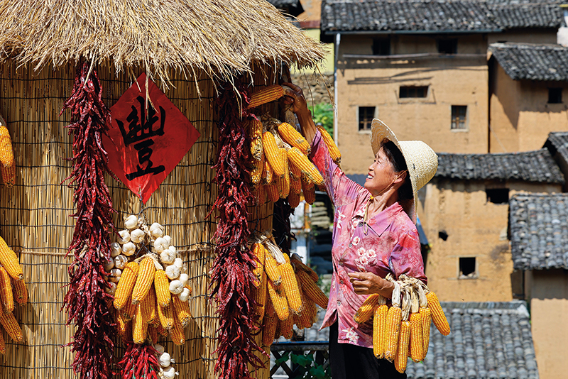 安徽省黄山市歙县阳产村村民正在土楼前晾晒丰收农作物(2025 年 9 月23 日摄) 新华社发(施亚磊摄)强化改革创新和政策支持