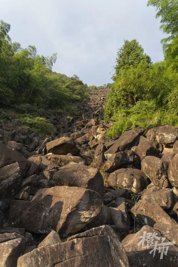 橙柿互动曾探访过临安高虹镇的“天石滩”,一块块巨大石头形成的“瀑布”,一直从山脚到山顶,这片巨石瀑布,长约1500米,最宽处150米,大的石头有几十吨,小的就像鸡蛋一样。