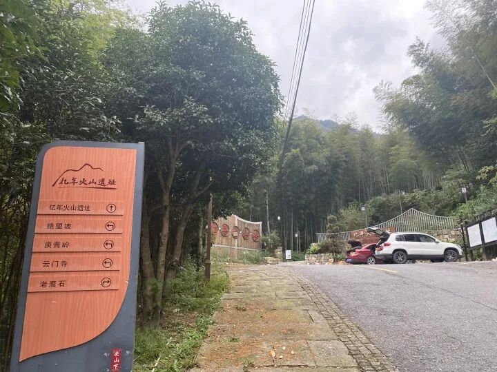 山脚下的提示牌也能看出爬山并不轻松,紧挨着山脚下的火山“巨石堆”的登山路线上,沿火山遗址—绝望坡—好汉坡—群鹰坡的路线,绝对是进阶级别登山爱好者的选择,总路程在8公里左右,整体强度不低,台阶多,坡度陡,石头规则不一,周围群山环绕,竹林幽静。