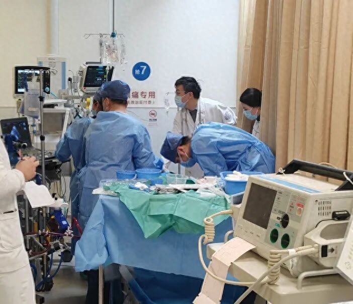 此时王阿姨生命体征十分不稳定,出现心跳停搏,医护人员进行持续高质量的心肺复苏,仍无法恢复自主循环,医院立即启动ECPR(体外心肺复苏),团队医生在超声引导下精准完成置管,迅速建立血管通路。随着暗红色的血液经膜肺氧合后转为鲜红色回输体内,患者的心脏重新恢复了跳动。