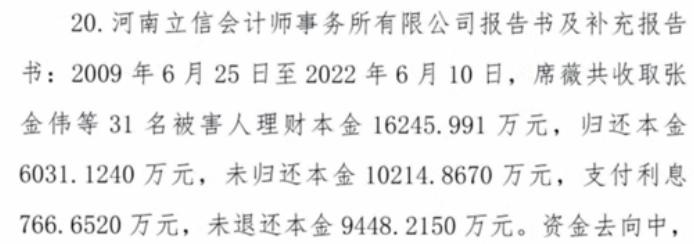 据判决书显示,截至案发,席某已经归还投资人本金6031万元、支付利息767万元,剩余9448万元还有待追偿。