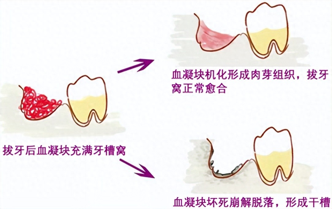 如果血凝块脱落,牙槽骨就会暴露在充满细菌的口腔中,一旦骨壁发生感染,就成了干槽症。