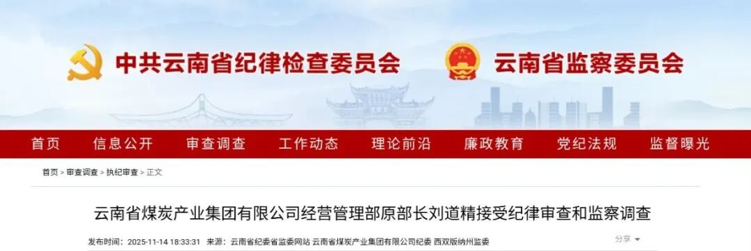据云南省煤炭产业集团有限公司纪委、西双版纳州监委消息:云南省煤炭产业集团有限公司经营管理部原部长刘道精涉嫌严重违纪违法,目前正接受云南省煤炭产业集团有限公司纪委纪律审查;经云南省监委指定西双版纳州监委管辖,正接受西双版纳州监委监察调查。