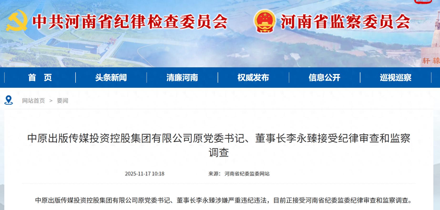 据河南省纪委监委网站11月17日消息,中原出版传媒投资控股集团有限公司原党委书记、董事长李永臻涉嫌严重违纪违法,目前正接受河南省纪委监委纪律审查和监察调查。