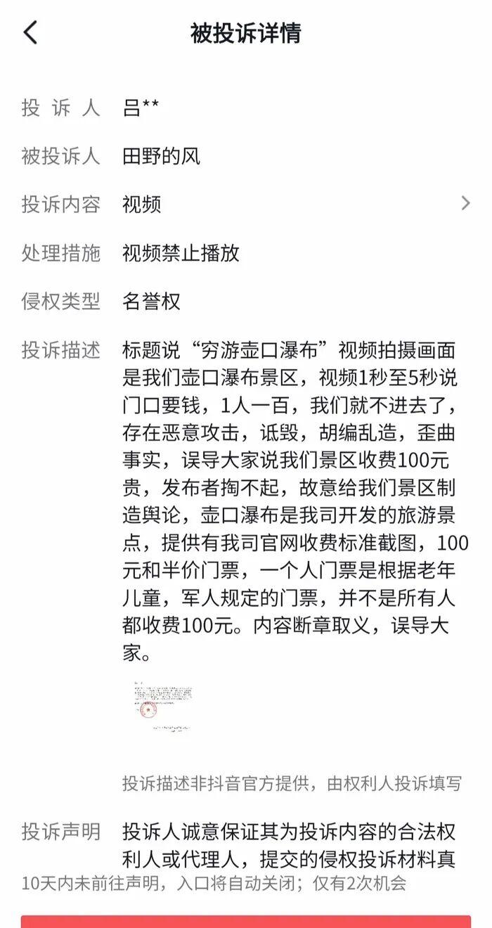 按照“被投诉详情”截图所示,投诉人吕某某投诉称,“标题说‘穷游壶口瀑布’视频拍摄画面是我们壶口瀑布景区,视频1秒至5秒说门口要钱,一人100(元),我们就不进去了,存在恶意攻击、诋毁、胡编乱造、歪曲事实,误导大家说我们景区收费100元贵,发布者掏不起……”与此同时,投诉人还宣称“壶口瀑布是我司开发的旅游景点”,强调针对不同人群收费标准不同,认为“内容断章取义,误导大家”。截至目前,涉事男子在社交平台曾经发布的两段视频均已不可见。