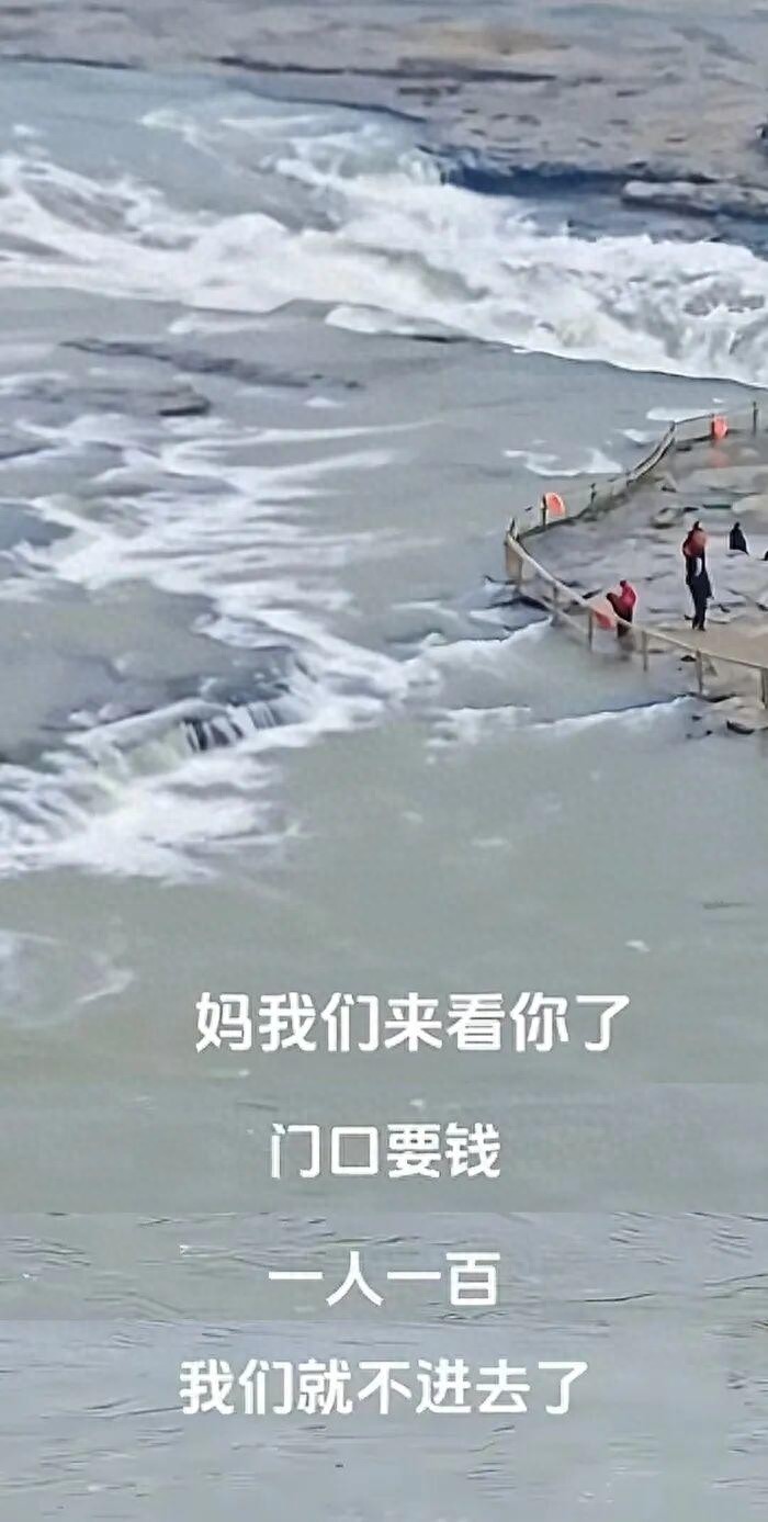 “妈,我们来看你了,门口要钱,一人100元,我们就不进去了,在这里看看你就行了。”近日,一男子在社交平台发布一段其在黄河壶口瀑布景区外拍摄的景区视频,并喊出以上话语一事,引发广泛关注。